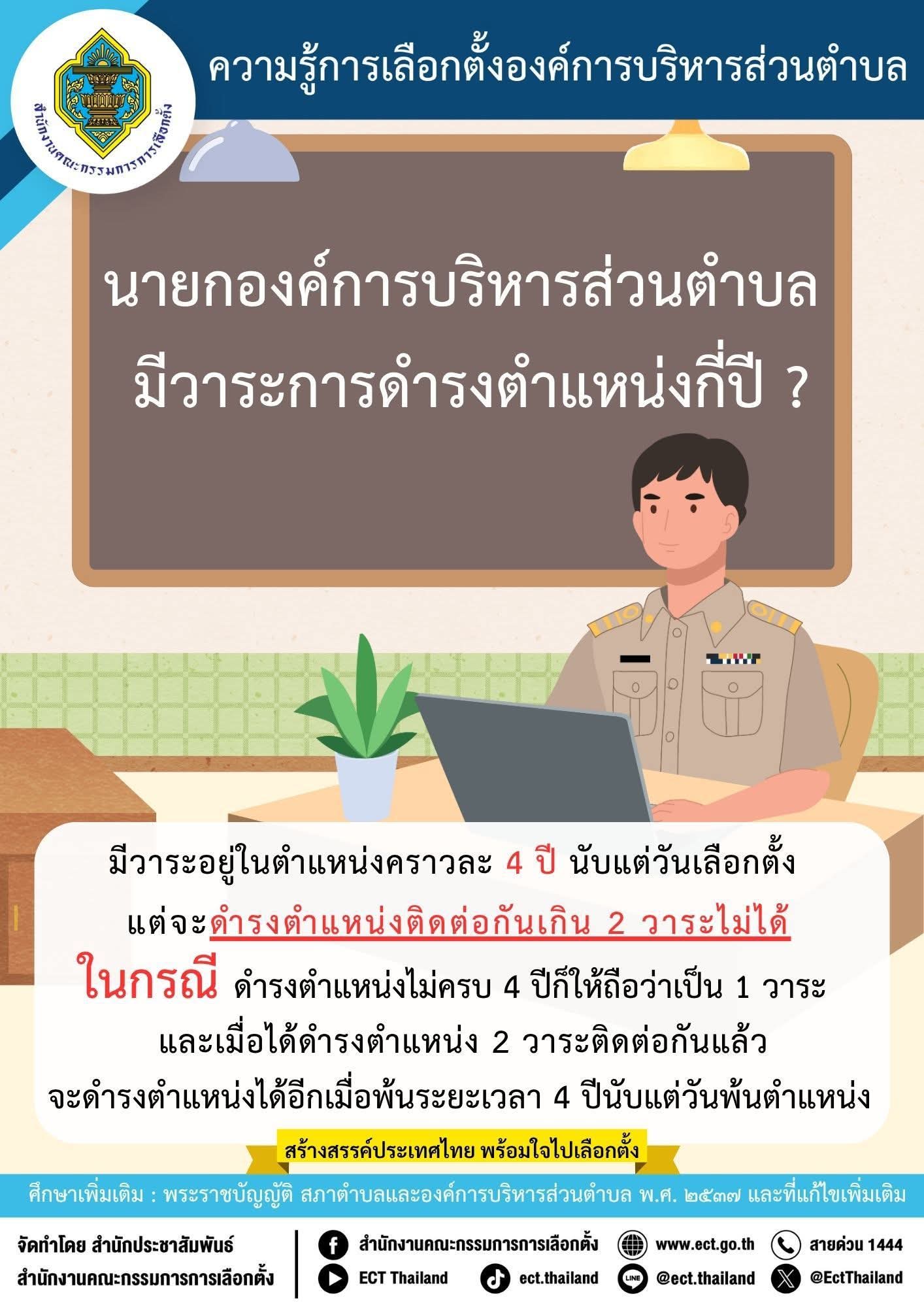 📌 ความรู้การเลือกตั้ง อบต. ที่ประชาชนควรรู้🗳️ นายกองค์การบริหารส่วนตำบล มีวาระดำรงตำแหน่งกี่ปี?รู้หรือไม่…👉 นายกองค์การบริหารส่วนตำบล (นายก อบต.) มีวาระดำรงตำแหน่งคราวละ 4 ปีนับตั้งแต่วันประกาศผลการเลือกตั้ง โดยเป็นตำแหน่งสำคัญที่ทำหน้าที่บริหาร พัฒนา และขับเคลื่อนนโยบายเพื่อประโยชน์ของประชาชนในพื้นที่ตำบลโดยตรง📍 การเลือกตั้ง อบต. จึงเป็นโอกาสสำคัญที่ประชาชนจะได้มีส่วนร่วมคัดเลือกผู้นำท้องถิ่นที่มีความรู้ ความสามารถ และตั้งใจทำงานเพื่อชุมชนอย่างแท้จริง💡 รู้ไว้…ใช้สิทธิอย่างถูกต้อง เพื่อประโยชน์ของชุมชนและท้องถิ่นของเรา🤍 สร้างสรรค์ประเทศไทย พร้อมใจไปเลือกตั้งการออกมาใช้สิทธิ คือพลังของประชาชนในการกำหนดอนาคตท้องถิ่นของตนเอง📣 จัดทำโดยสำนักงานประชาสัมพันธ์สำนักงานคณะกรรมการการเลือกตั้ง#กกตระยอง #สำนักงานคณะกรรมการการเลือกตั้ง#RayongNewsonline #เลือกตั้งท้องถิ่น #อบต#ใช้สิทธิเลือกตั้ง #ประชาธิปไตยท้องถิ่น