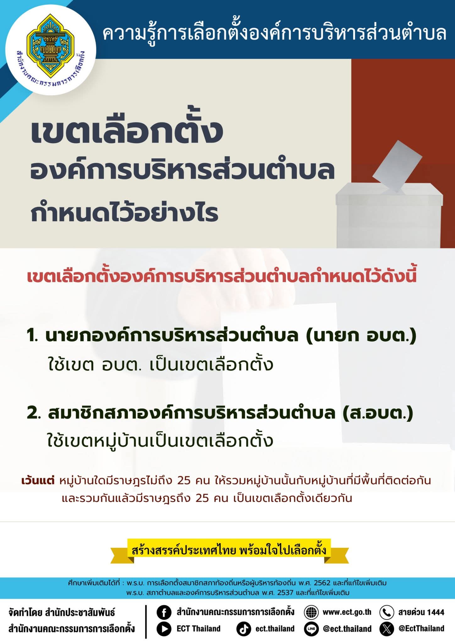 📌 รู้ทันการเลือกตั้งท้องถิ่น!เขตเลือกตั้งองค์การบริหารส่วนตำบล (อบต.) กำหนดไว้อย่างไร?เขตเลือกตั้ง อบต. ถูกกำหนดขึ้นตามจำนวนประชากรและพื้นที่ของแต่ละตำบล เพื่อให้การเลือกตั้งเป็นธรรมและสะท้อนเสียงของประชาชนอย่างแท้จริง โดยหนึ่งเขตเลือกตั้งจะมีสมาชิกสภาองค์การบริหารส่วนตำบล (ส.อบต.) ตามที่กฎหมายกำหนด ประชาชนผู้มีสิทธิเลือกตั้งควรตรวจสอบว่าอยู่ในเขตเลือกตั้งใด เพื่อเข้าคูหาใช้สิทธิได้อย่างถูกต้อง ไม่เสียสิทธิ และไม่สับสนในวันเลือกตั้ง💡 รู้ไว้…ใช้สิทธิอย่างถูกต้อง เพื่อประโยชน์ของชุมชนและท้องถิ่นของเรา🤍 สร้างสรรค์ประเทศไทย พร้อมใจไปเลือกตั้งการออกมาใช้สิทธิ คือพลังของประชาชนในการกำหนดอนาคตท้องถิ่นของตนเอง📣 จัดทำโดยสำนักงานประชาสัมพันธ์สำนักงานคณะกรรมการการเลือกตั้ง#กกตระยอง #สำนักงานคณะกรรมการการเลือกตั้ง#RayongNewsonline #เลือกตั้งท้องถิ่น #อบต#ใช้สิทธิเลือกตั้ง #ประชาธิปไตยท้องถิ่น