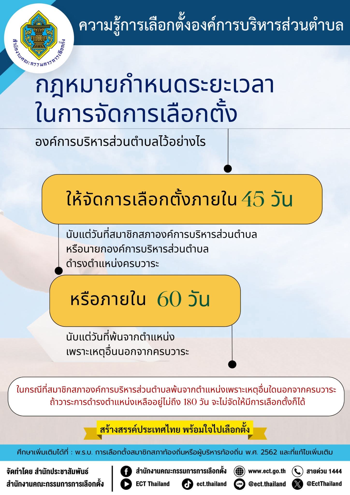 📣 รู้หรือไม่? กฎหมายกำหนดระยะเวลาจัดการเลือกตั้ง อบต. ไว้อย่างไร🗳️ เมื่อสมาชิกสภาองค์การบริหารส่วนตำบล (อบต.) หรือผู้บริหารท้องถิ่นพ้นจากตำแหน่ง หรือมีเหตุให้ตำแหน่งว่าง👉 กฎหมายกำหนดให้ต้องจัดการเลือกตั้งภายใน 45 วัน หรือไม่เกิน 60 วัน แล้วแต่กรณี💡 รู้ไว้…ใช้สิทธิอย่างถูกต้องเพื่อให้ประชาชนได้มีส่วนร่วมกำหนดทิศทางการพัฒนาชุมชน และสร้างความเข้มแข็งให้การปกครองท้องถิ่น🤍 สร้างสรรค์ประเทศไทย พร้อมใจไปเลือกตั้งการออกมาใช้สิทธิ คือพลังของประชาชน ในการกำหนดอนาคตท้องถิ่นของตนเอง📣 จัดทำโดยสำนักงานประชาสัมพันธ์สำนักงานคณะกรรมการการเลือกตั้ง#กกตระยอง #สำนักงานคณะกรรมการการเลือกตั้ง #เลือกตั้งท้องถิ่น #อบต#ใช้สิทธิเลือกตั้ง #ประชาธิปไตยท้องถิ่น